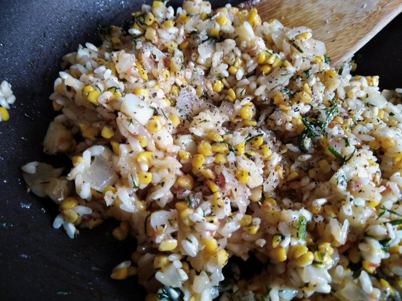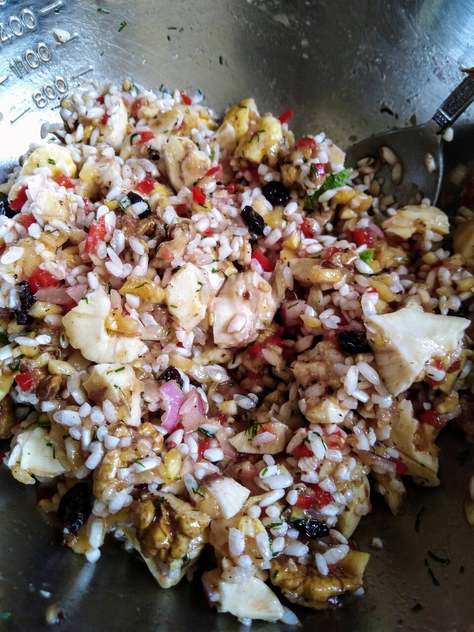 上記の生の刻み野菜に洗った米を加え、大きめに割った栗、小さめに割ったくるみ、カランツかレーズン、あればパセリやディル(パセリを入れたかったところですが切らしてたので冷凍ディル少し)、塩、
