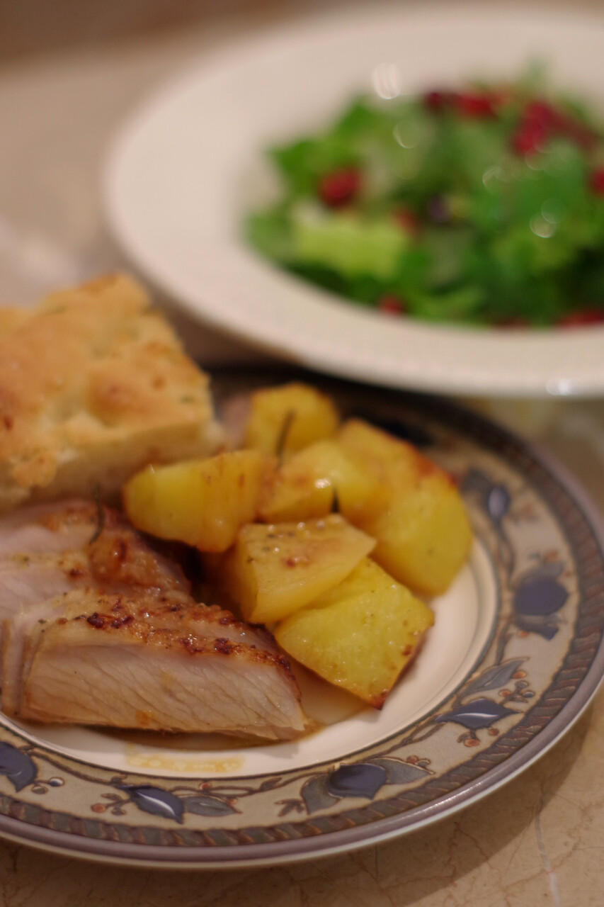 )。パンは長女に担当してもらい、フォカッチャにしました。ポークは塊肉にニンニクやマスタードなど適当に混ぜたのをすり込んでマリネしておき、オレンジとレモンの汁、白ワインなどかけてポテトと(ローズマリー、ニンニクも)一緒に焼いたもの。チキンが食べたかった次女には骨付きもも肉をポテトと一緒にレモン味で。