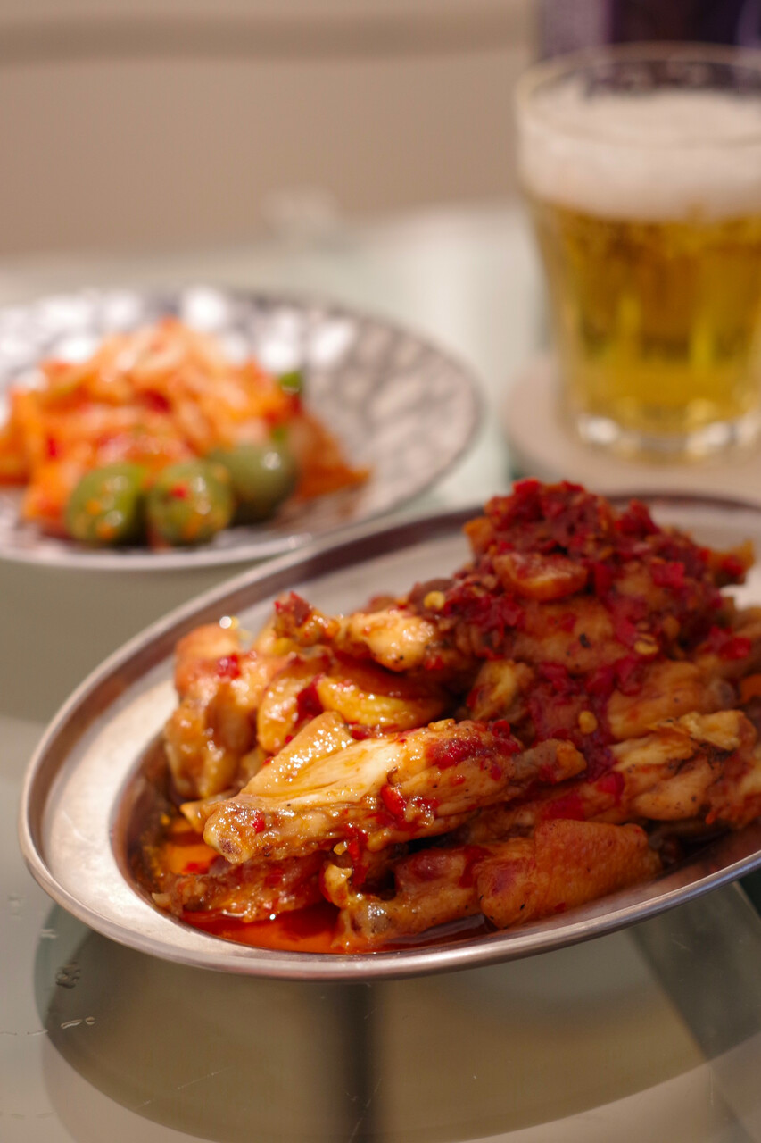 剁椒で、手羽中の炒めもの。間違いなくビールの進む味!この日はオリーブキムチと白菜キムチも一緒に、なぜか唐辛子だらけでした。