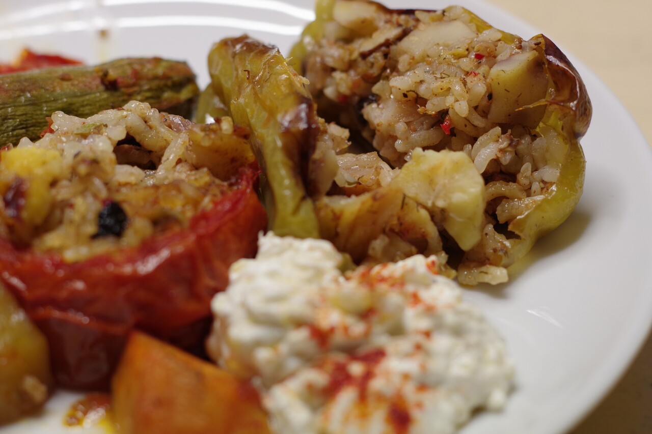 炒めてあったズッキーニのことを忘れそうになりましたが(笑)ギリシャヨーグルトと塩、クミンパウダーを加え混ぜたのがイェミスタに添えてある白いものです。仕上げにふりかけてあるのはホットパプリカ。ちなみにイェミスタそのものには動物性食品が一切入ってないので、ニスティシモ(オイルOKの日)、ヴィーガン対応です。