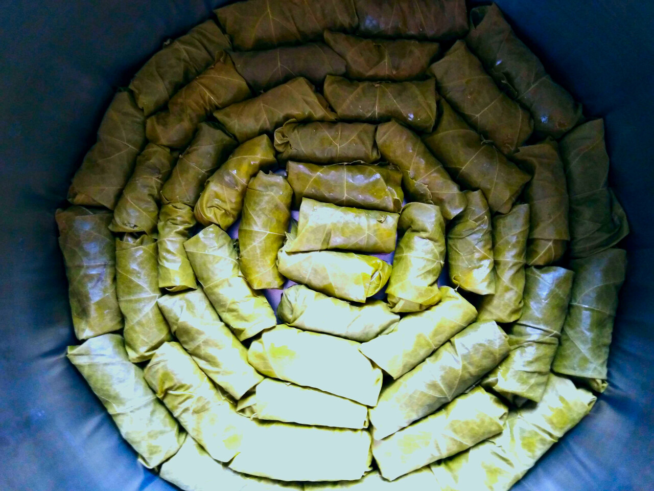 ぶどうの葉っぱでフィリングを包み、鍋に並べていきます。