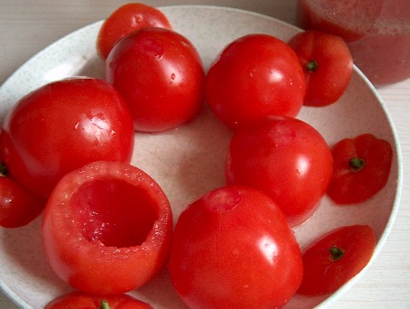 トマトはヘタの付いてる方を切り、中身をスプーンでくり抜く。この時種を分ける壁の部分もしっかり目に削ると水っぽくならない。中に塩、砂糖各少々をすり込んで伏せておく。くり抜いた中身は細かく刻むかFPでピュレにしておく。