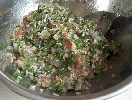 野菜に米などのフィリングを詰めたイェミスタの中でも、トマトやピーマンは作り方が簡単だということもあって、最もポピュラーです。これに使う野菜は普通大きいものですが、私は小さいトマトやピーマンで作るのが好き。これだと見た目も可愛いし、フィリングと野菜との割合もいいんですが、もちろんお好みで大きいものを使っても結構です。