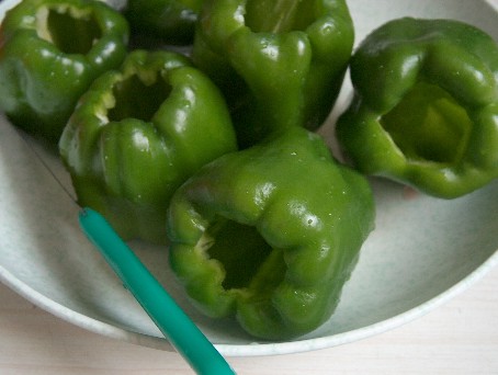 ピーマンはヘタの周りにナイフを入れ、取り除く。中に指を入れてワタや種を除く。