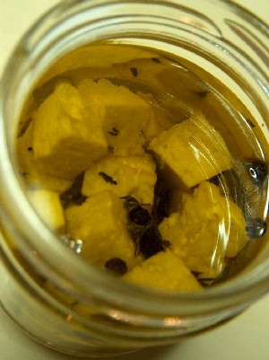 先月、お土産にもらったセリフォス島のチーズ。食べきらなかった分は、粒胡椒・サボリー少々と共にオイル漬けにしておいたのです。