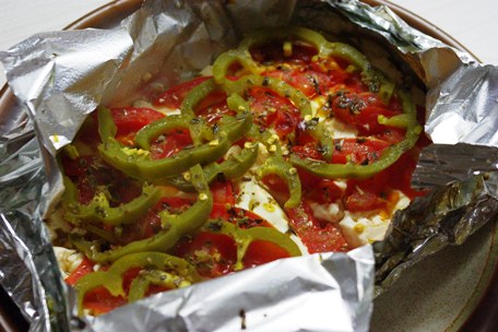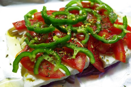 1.材料を包めるぐらいのアルミホイルを用意。手前半分にフェタチーズと野菜のスライスを載せます。野菜はトマト、玉ねぎ、ピーマン(又は唐辛子)のどれか好みのもの又は全部を好きな順番で。