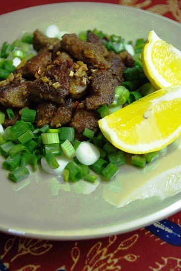 基本的にはラムか牛のレバーを小さく切って小麦粉をまぶし、カラッと揚げるか揚げ焼きにしたもので、シンプルな味ながらも付け合せのオニオンとのコンビネーションが最高。ビールやラキ(蒸留酒)が進みます