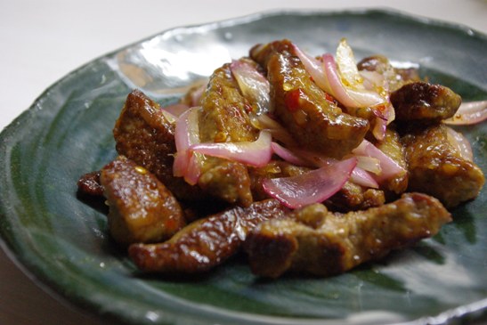 粉をまぶしてカリッと焼いたレバーと玉ねぎをスイートチリソースで仕上げてあるのですが、確かにレバーが苦手な人にも食べやすそう。