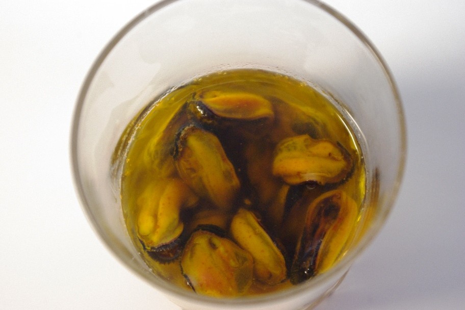 小さな鍋かフライパンにたっぷりのオリーブオイル(最終的に貝の身が隠れる程度)と叩いたニンニクを加え加熱して香りを出し、ムール貝の身を加えます。