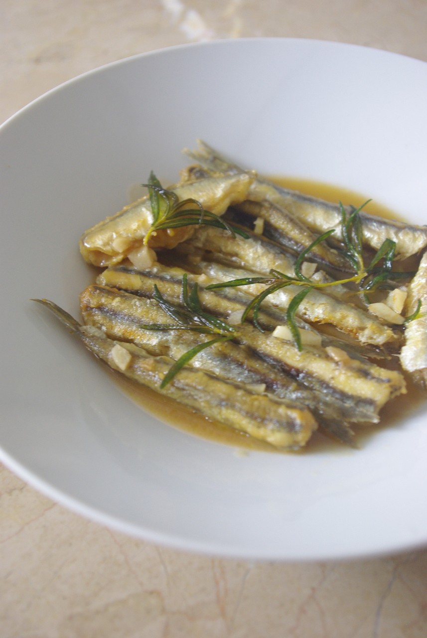 小麦粉をまぶした魚を少なめのオリーブオイルで揚げ焼きにする。魚を揚げたフライパンをそのまま使うので、オイルと小麦粉はある程度残っていてOK(多すぎたら余分は捨てる)。ローズマリー、ニンニクの順に加え炒め、白ワイン、ワインビネガー、砂糖少々を加えマリネ液を作る。これを揚げた魚にかけてできあがり。すぐに食べても時間を置いても美味しいです。