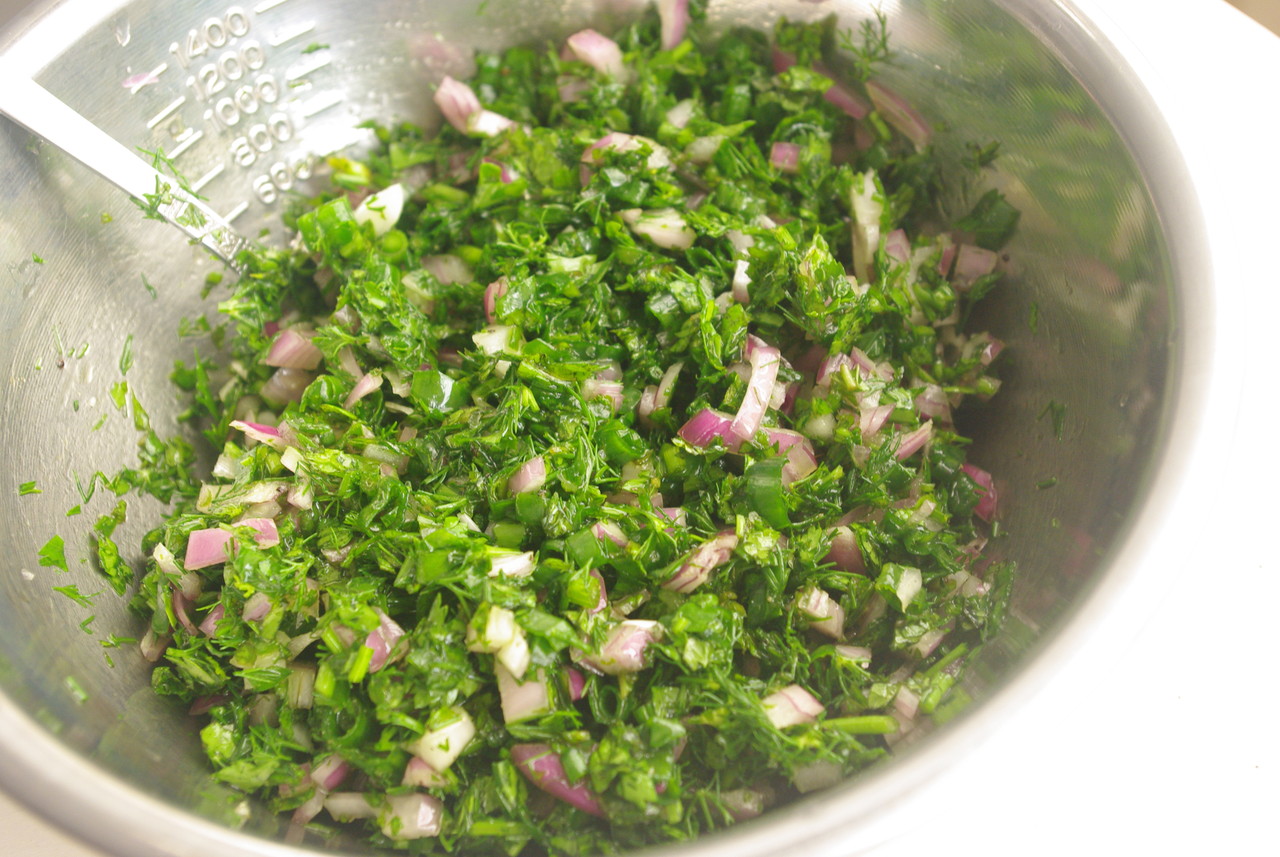 玉ねぎ、ねぎ、ハーブ(パセリ、ディル、スペアミント)をざくざく刻んで調味料を加えて混ぜたら、この時点ですでにおいしそう♪何度も書いてますが、オリーブオイルをたっぷり加え、塩辛く(煮ると薄まるので)味付けするのがポイントです。