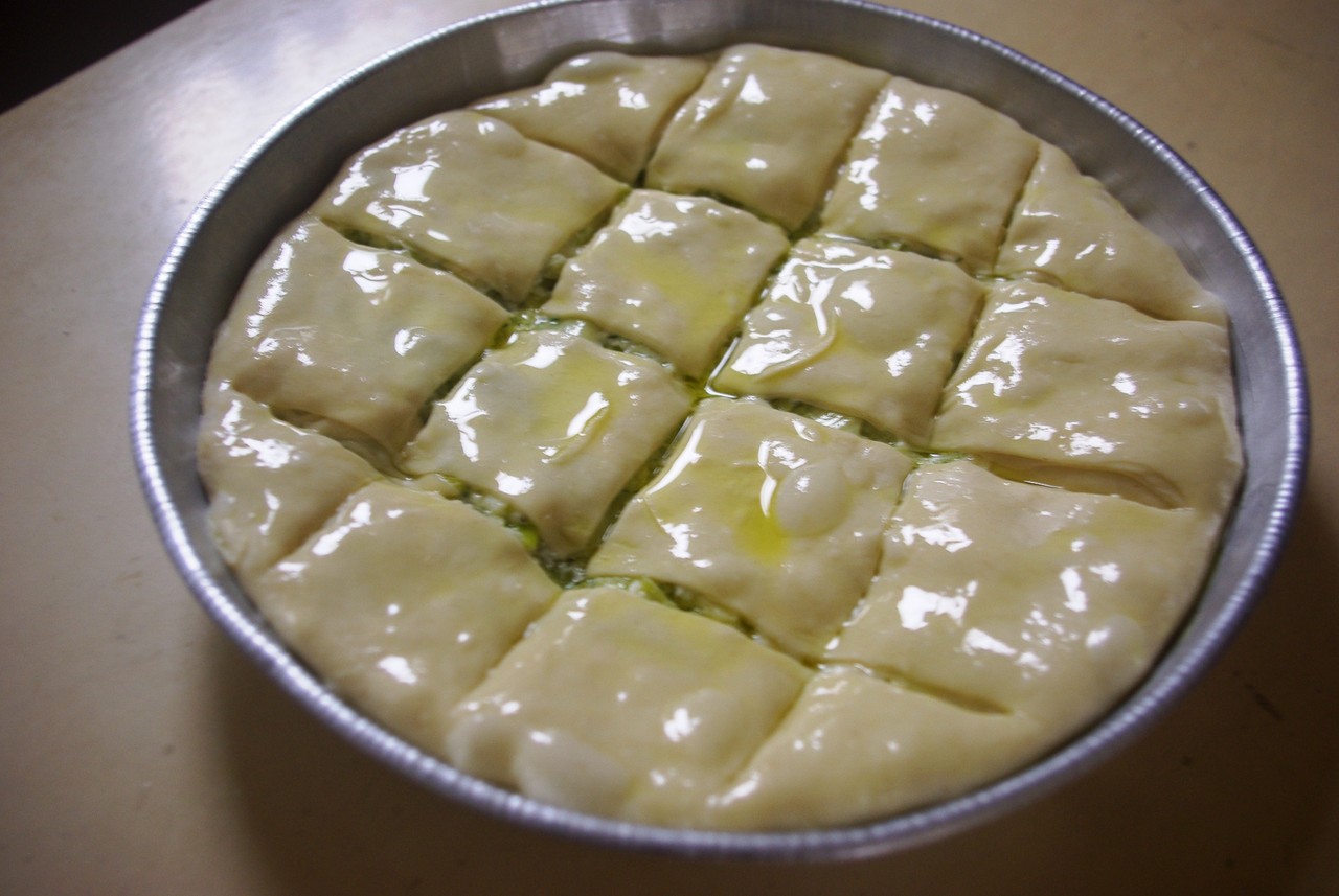残りの生地も同様にのばしてオイルを塗りながら重ね、フィリングの上にゆるくかぶせる。端は底に折り込む。上にオイルを少し多めに塗り、よく切れる包丁で上の生地に切り目(あとで切り分けたい大きさに)を入れる。