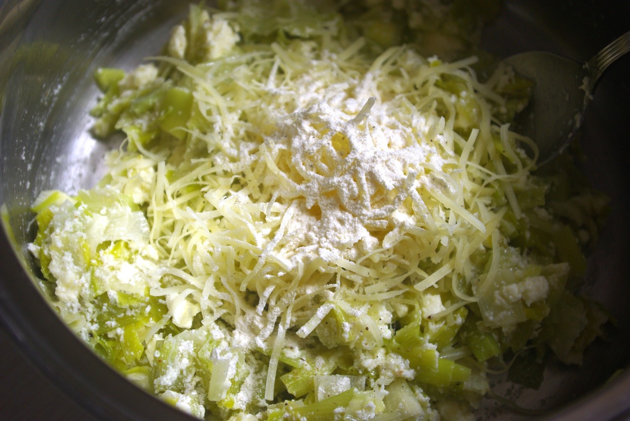 砕いたフェタチーズ、小麦粉、ディルを加え、胡椒と必要なら塩も加え味をととのえる。