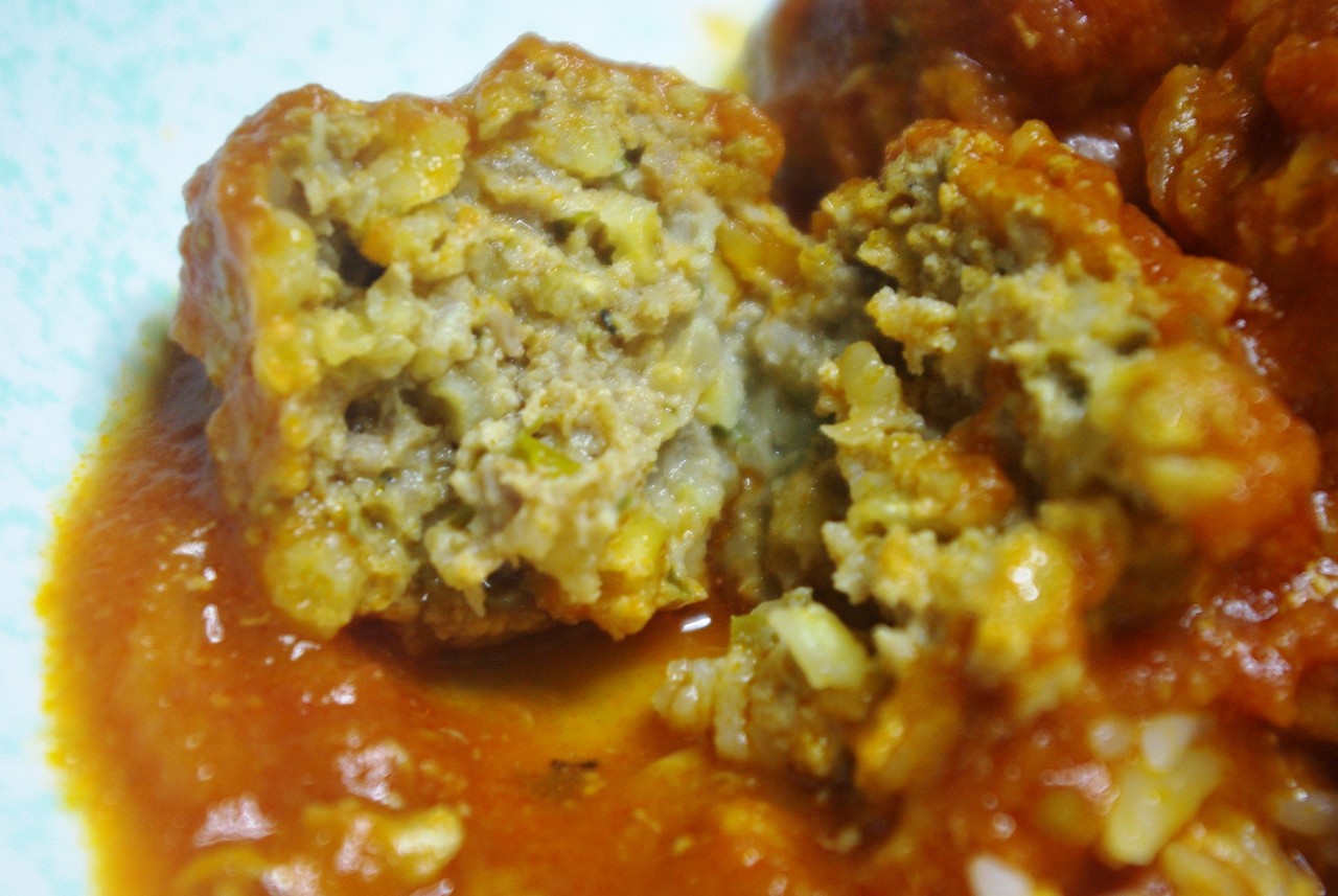 昔、ロドス島の奥さんが作っているのを見た、「ヴォリ・メ・プリグリ」という郷土料理。ひき割り小麦(プリグリ※)入りミートボールのトマトソース煮です。