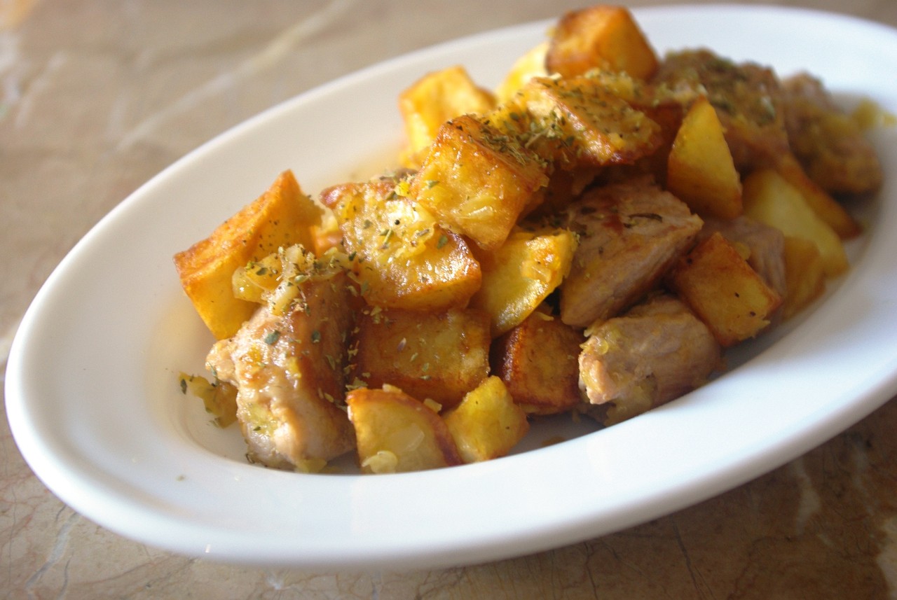 ギリシャ料理のティガニァのバリエーションみたいな感じで、ポークとポテトのレモン唐辛子ソテー。