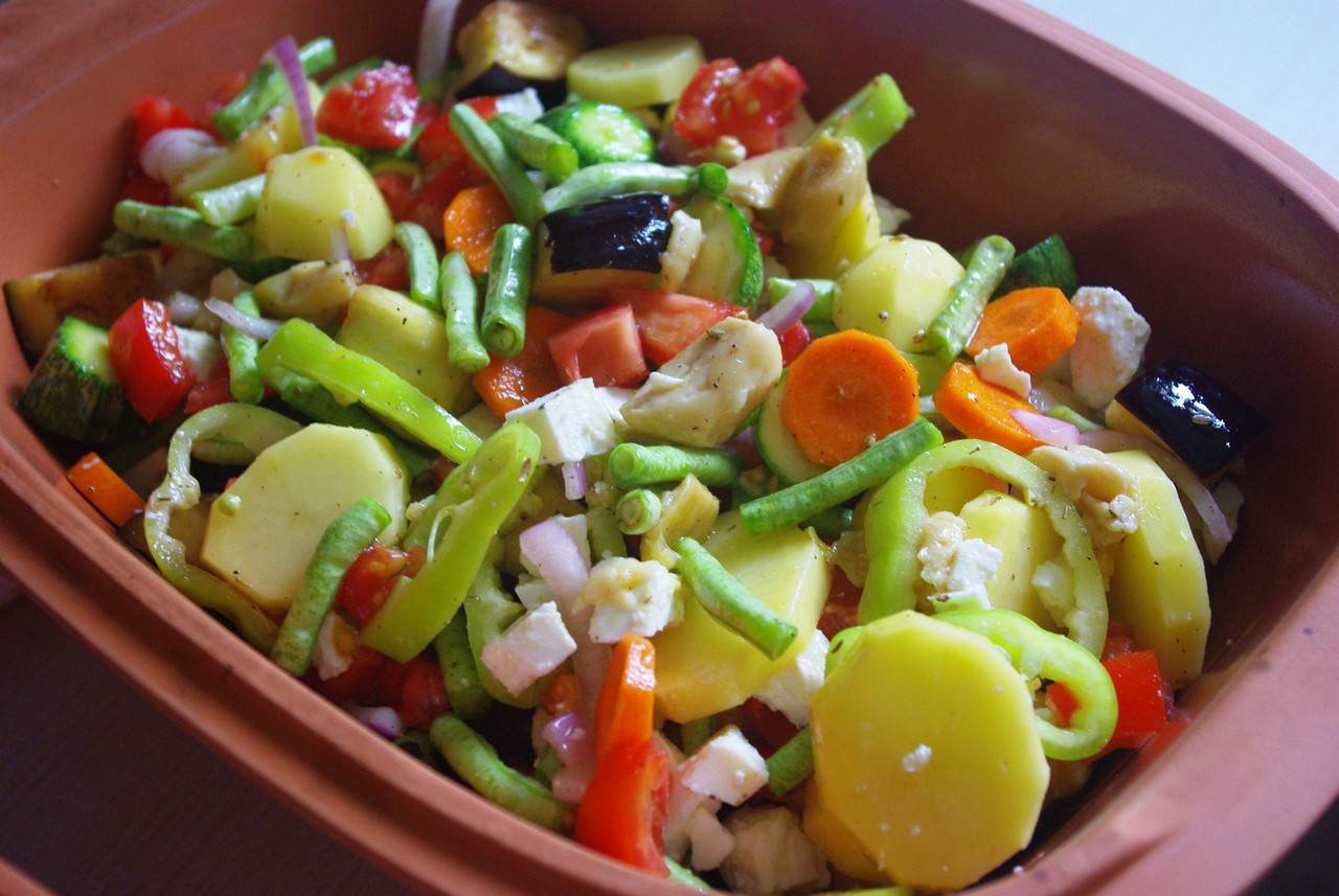 野菜は、なす、ズッキーニ、バナナピーマン、トマト、ささげ(いんげんでも)、じゃがいも、玉ねぎ、にんじんを入れました。大きなボウルに入れて、角切りにしたフェタチーズ、塩、胡椒、セイボリー(他のハーブでも)、オリーブオイルを加え混ぜます。チーズ入りだと家族がよく食べてくれるので入れましたが、チーズなしでもお好みで。フェタの代わりに少し塩気のあるハードタイプの羊チーズでもいいです。