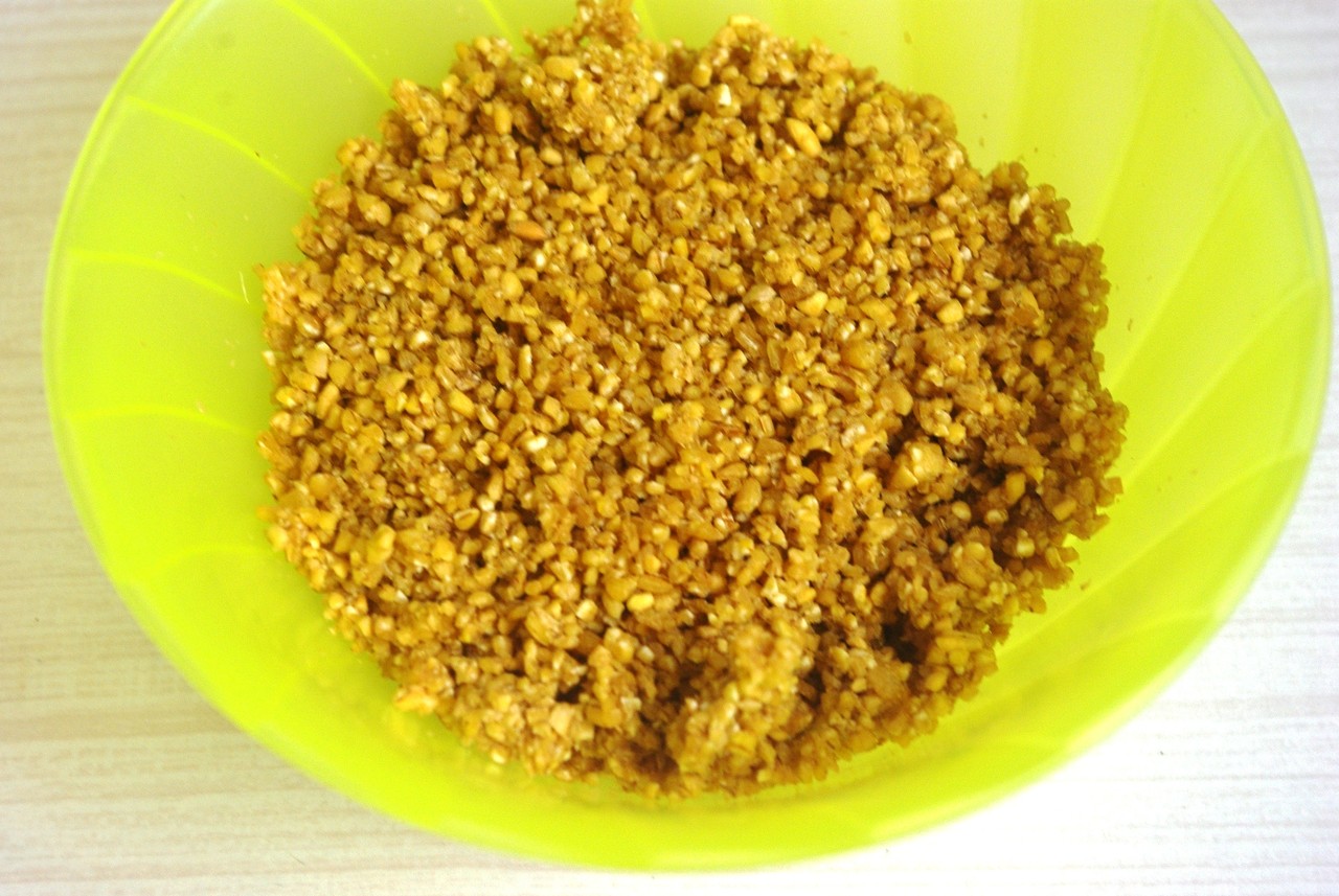 ギリシャのトラハナにはスイートとサワーがあり、どちらを使ってもできます。私はサワートラハナが好きなので、うちにあるのは基本的にそちらなのですが、比較のためにスイートトラハナで作った写真も撮っておきました。赤パプリカのソースが添えてある完成品写真のはサワートラハナで作ったもの、こちらの断面写真はスイートトラハナのです。使うトラハナによって微調整が必要ですが、適当で大丈夫です。