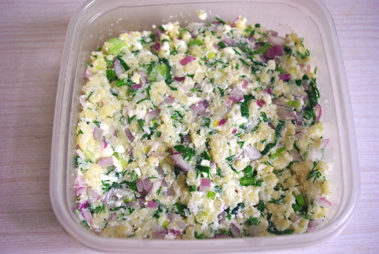 冷ましたトラハナに玉ねぎ〜ベーキングパウダーまでの材料を加えしっかり混ぜ合わせる。この時、水を約大さじ2加えて丸めやすい硬さにする(ここまで前日に作っておいてもOK)。