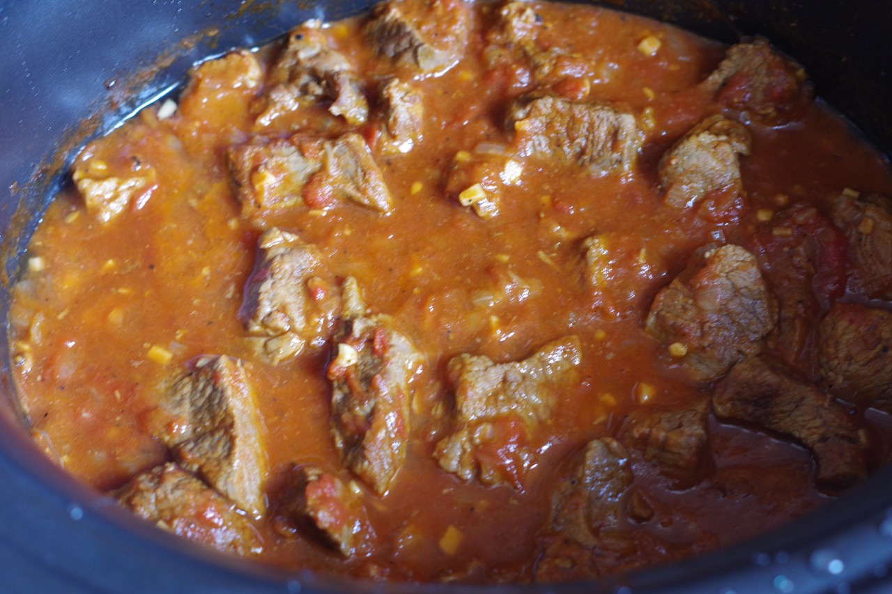 トマトソースを肉の入った鍋に加え、水分が足りないようなら水を少量足す。蓋をして、肉が柔らかくなるまで弱火で(肉の質によるが2時間ぐらい)煮込む。途中、もし水分が足りないなら水を足すが、できあがりは汁っぽくなくとろみのあるソースになるよう仕上げる。塩胡椒で味をととのえる。