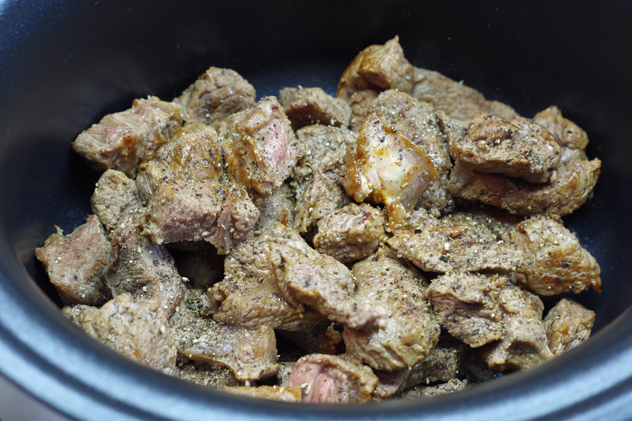 フライパンを熱し、オリーブオイル(またはオイルとバター)をひく。重ねず入るだけの肉を加え、焼き付ける。肉汁を焦がしすぎないよう火加減に注意し、全体に色づいたら鍋に取り出す。残りの肉も同様に焼く。