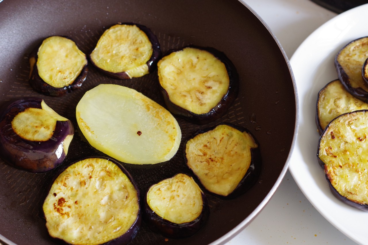 フライパンを熱し、オリーブオイル適量をひいてなすを重ならないように並べ焼く。柔らかくなり色づくまで両面焼き、キッチンペーパーに取る。残りのなすとじゃがいもも同様に焼く。
