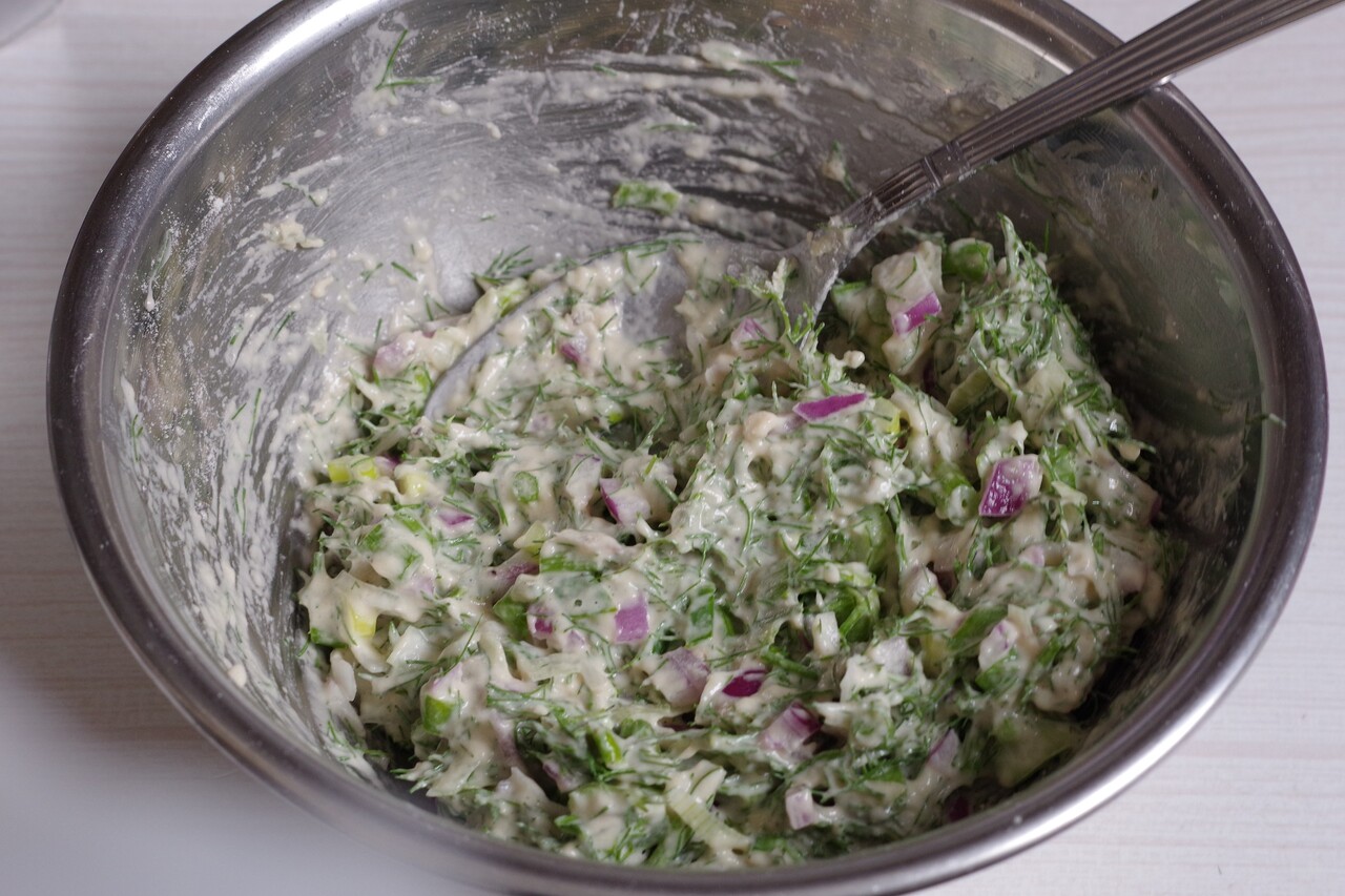 フェンネルのケフテデスはそのままでもおいしいですが、別の日にはタラモサラタをソースとして添えてみました。タラマまたはたらこをすりつぶし、玉ねぎすりおろし、水でふやかしたパンの白い部分、レモン汁、油を加えて混ぜます。