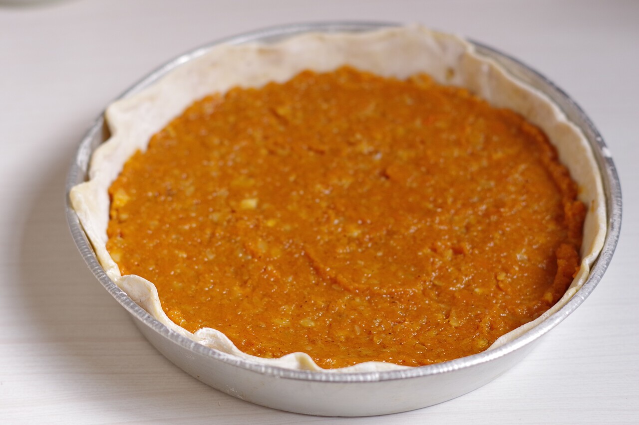 生地をのばし、バターかショートニングもしくは油を塗ったパイ皿に敷く。フィリングを入れてならし、上の生地ものばしてかぶせ、端をねじってとめる。