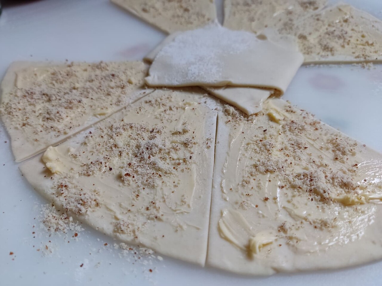 マケドニキ・スフォリアータの生地を作っておく。折り込み用にバターを使用。好みで、粉状に挽いたアーモンドにシナモンパウダーを混ぜたもの(※)を少し散らして折り込む。