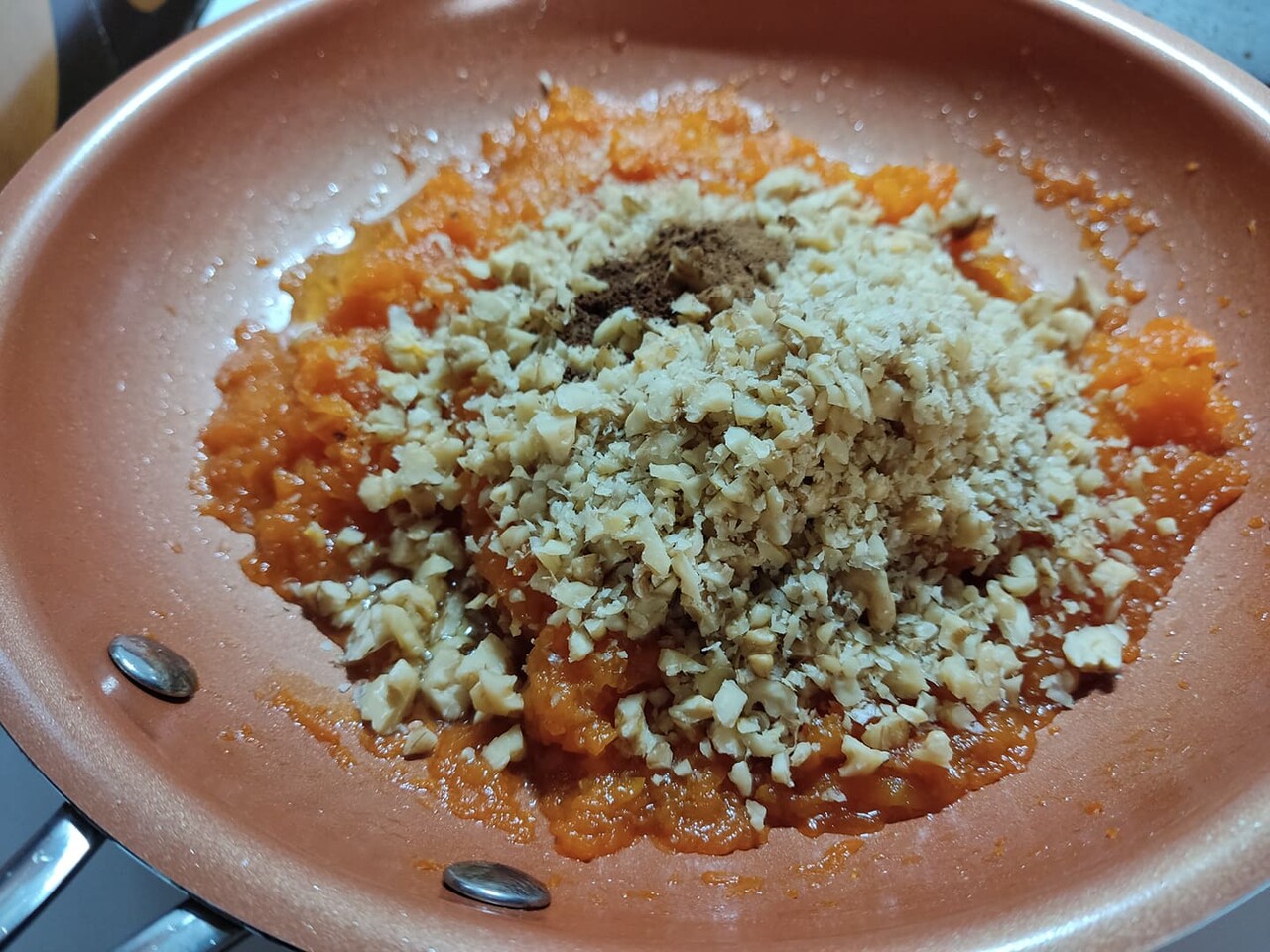 かぼちゃに砂糖を加え弱めの火にかけ、水分が出てきたら中火にして汁気を飛ばしながら煮る。汁気がほとんどなくなったら火から下ろし、くるみとスパイス類を加え混ぜあわせ冷ましておく。