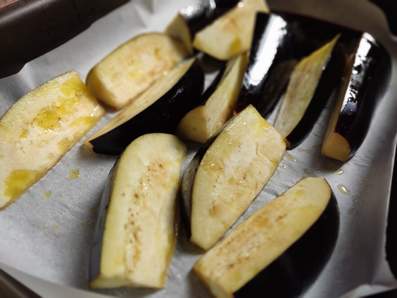 うちは毎週日曜はピッツァの日だし、オーブンはそれほど気にせず使ってるのですが、薄いシートケーキを焼くのにオーブンをつけるのはもったいなくて、ついでに晩ごはんの準備を……と考えてなすが目に留まったのでした。
