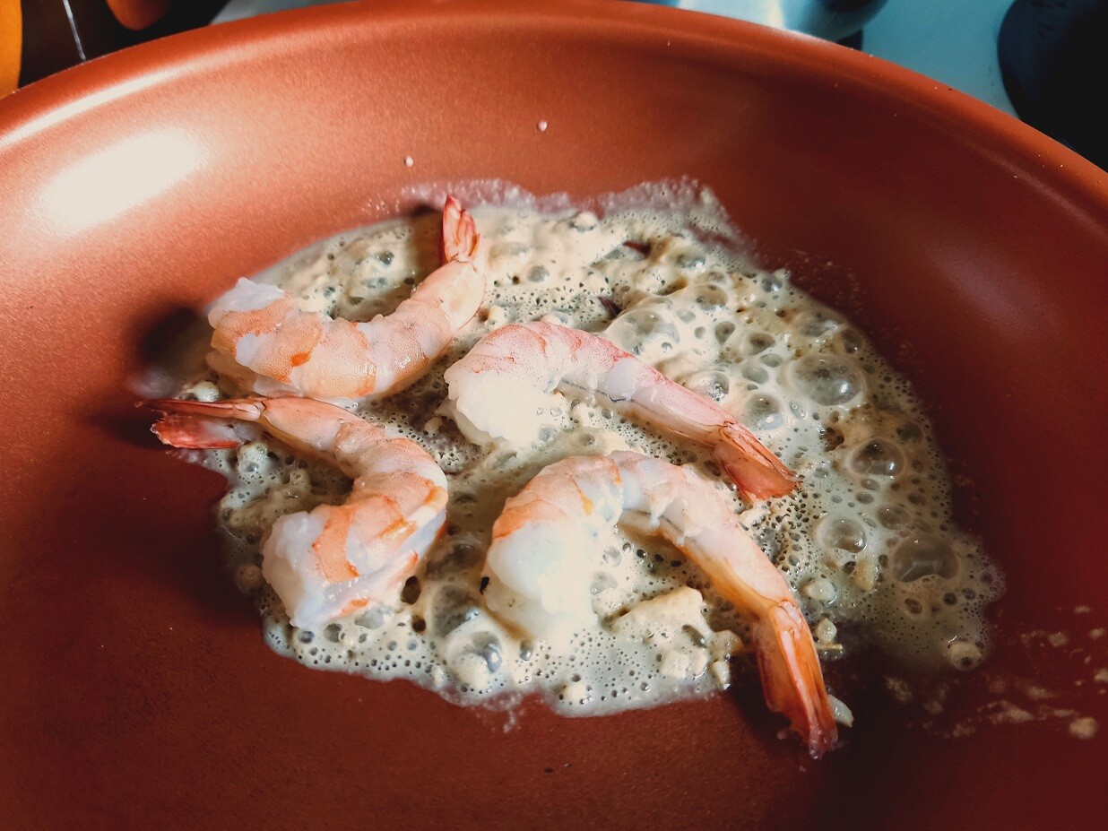 MEMO:具材はえびを使いましたが、貝(私は冷凍ムール貝の剥き身をよく使います)、いか、きのこ、カリフラワーなどもおすすめです。オイルなしパスタでくっつきやすいので、ソースを気持ちゆるめにすると食べる時に丁度よくなります。ハーブはパセリのほかにバジル、フェンネル、ディル、オレガノなど合いそうなものなら何でも。香りが強いハーブは控えめに加えます。