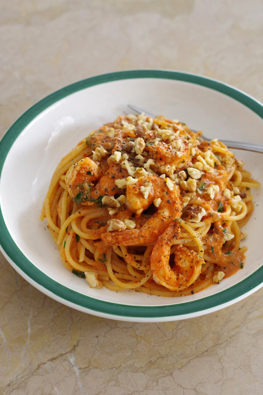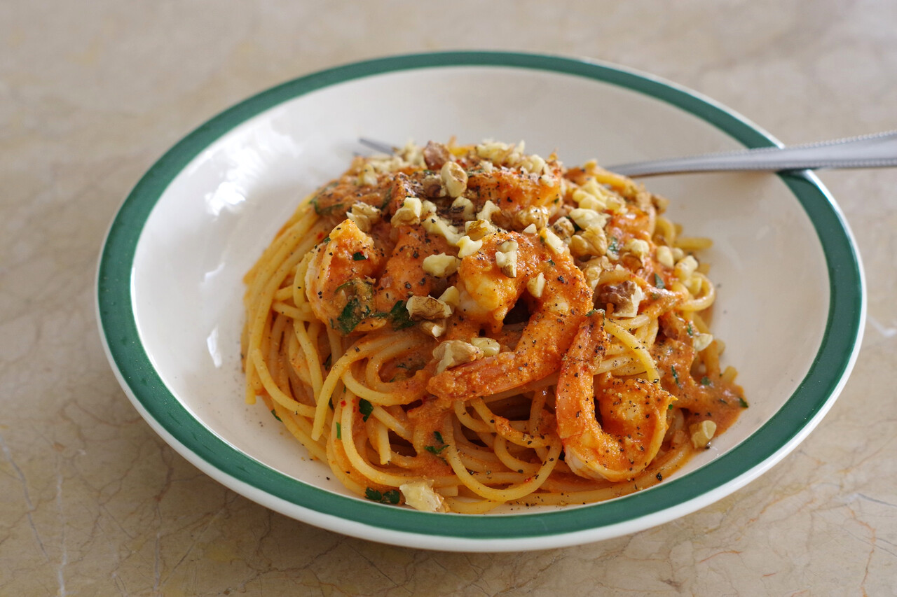 Αλάδωτα νηστίσιμα μακαρόνια με γαρίδες, ταχίνι και πελτέ