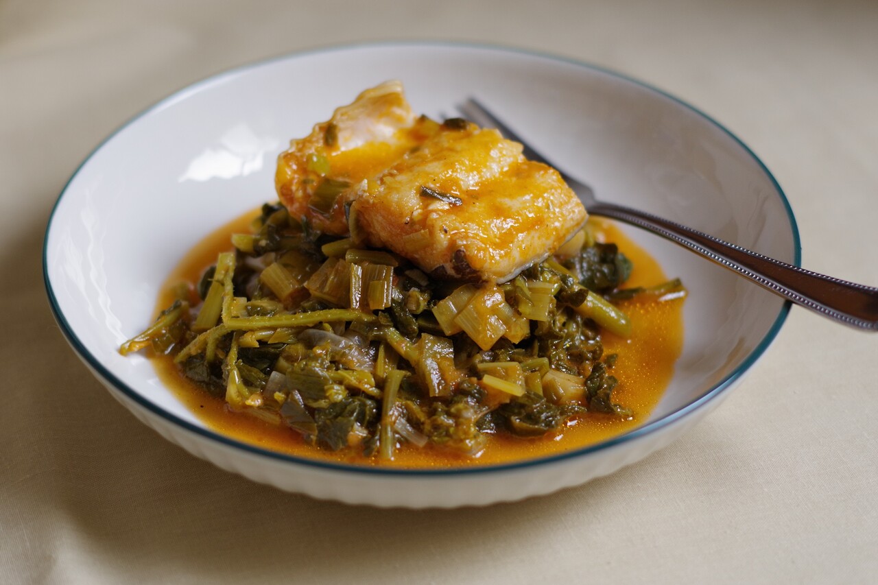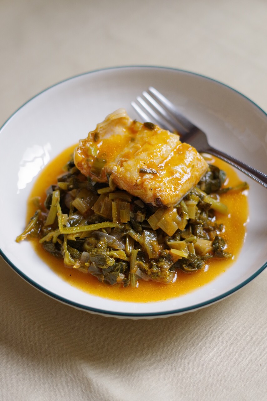 干し鱈とホルタの煮込みは、「干し鱈で何をしようかな……」と考えたとき私が食べたい料理のトップ5には間違いなく入るものです。使用する葉っぱ類はこれとは特に決まっていなくて、その時々に市場で目についたものだとか、気分に合った香りのハーブなどあわせます。