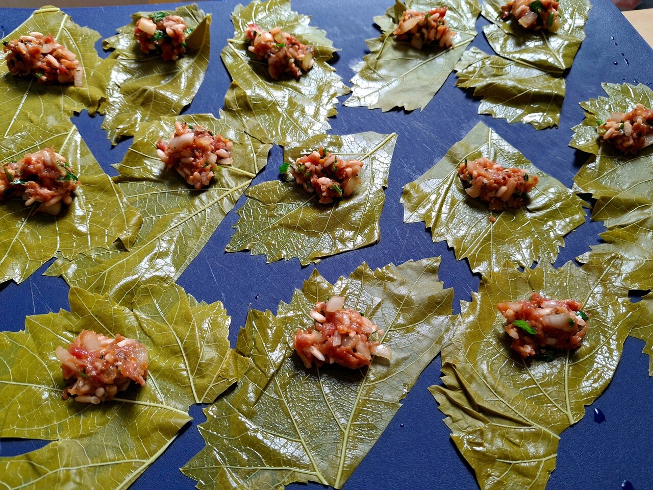すべての工程を一度にやろうと思うと大変なので、葉を買ってきたら洗って茹でて切るところまでを当日にやり、翌日に仕上げるというのがいつものパターンです。フィリングは生の材料を混ぜあわせるだけなのですぐできるし、包むのは葉っぱをいっぱい並べてちょんちょんとフィリングをのせて巻いていく流れ作業。こうすると、結構楽に作れますよ。