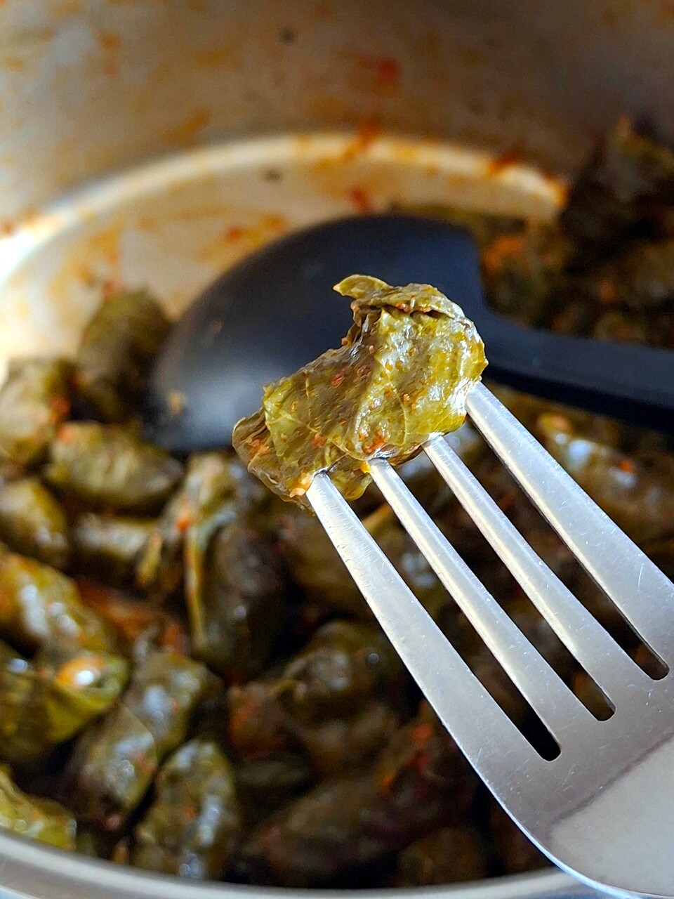 叔母さん式のドルマダキァは小指の関節2つ分くらいのから豆粒みたいなのまで、大きさに幅があるのも味のうち。ポテトチップスをつい食べすぎてしまうのは形状や揚がり具合の不揃いさのせいでもあるよなぁといつも思ってるのだけど、叔母さんのドルマダキァにもそれに似たものを感じます。