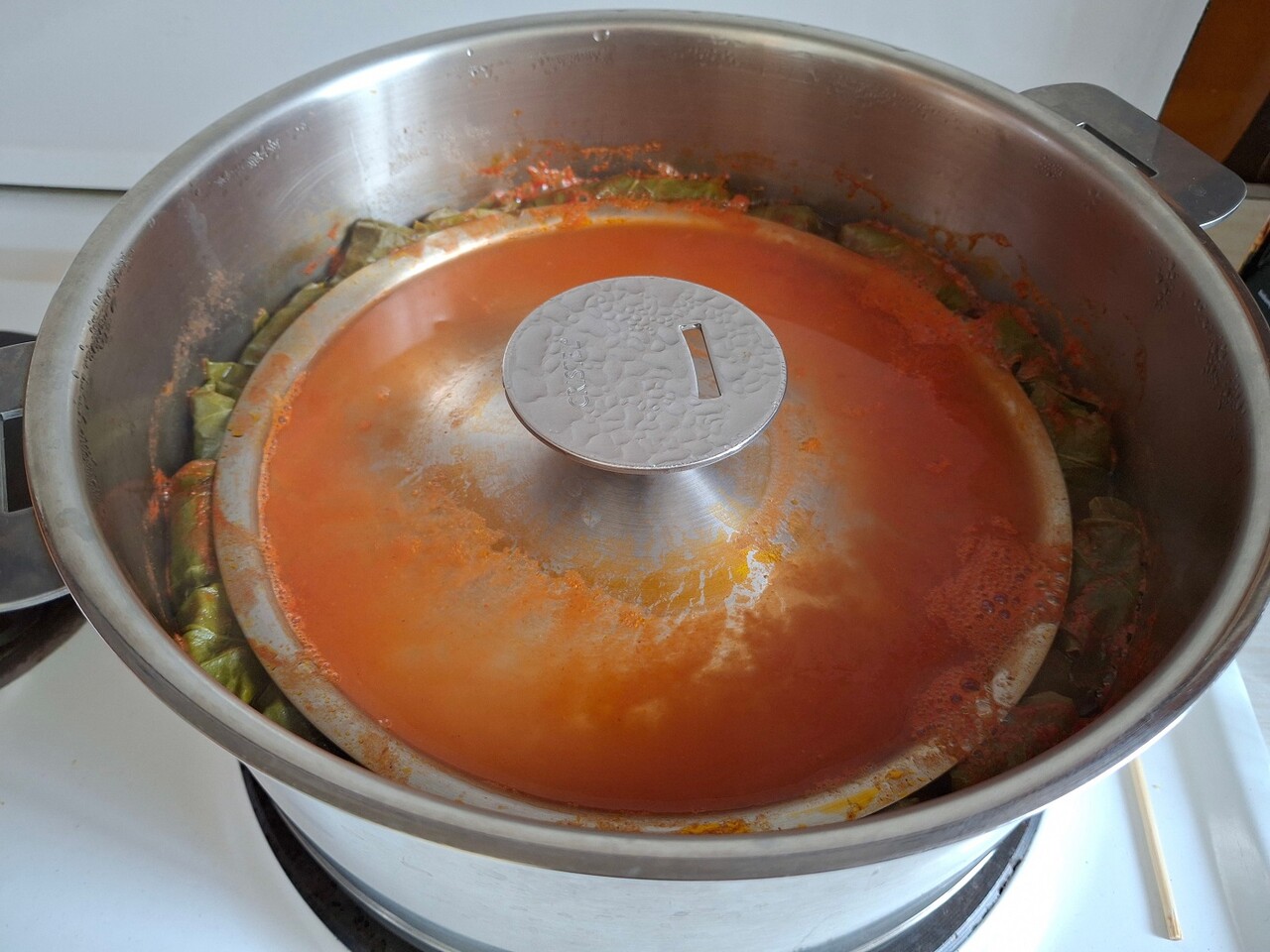 ある程度重さのある落しぶた(耐熱の皿など)、さらにふたをして、全体がやわらかくなり汁気がほぼなくなるまで煮たらできあがりです。肉入りのドルマダキァは基本的に温かい状態で食べられますが、このトマト味のは冷たくてもおいしく、冷蔵庫に入れておいたのをそのまま食べるのが私や娘達は好きだったりします。