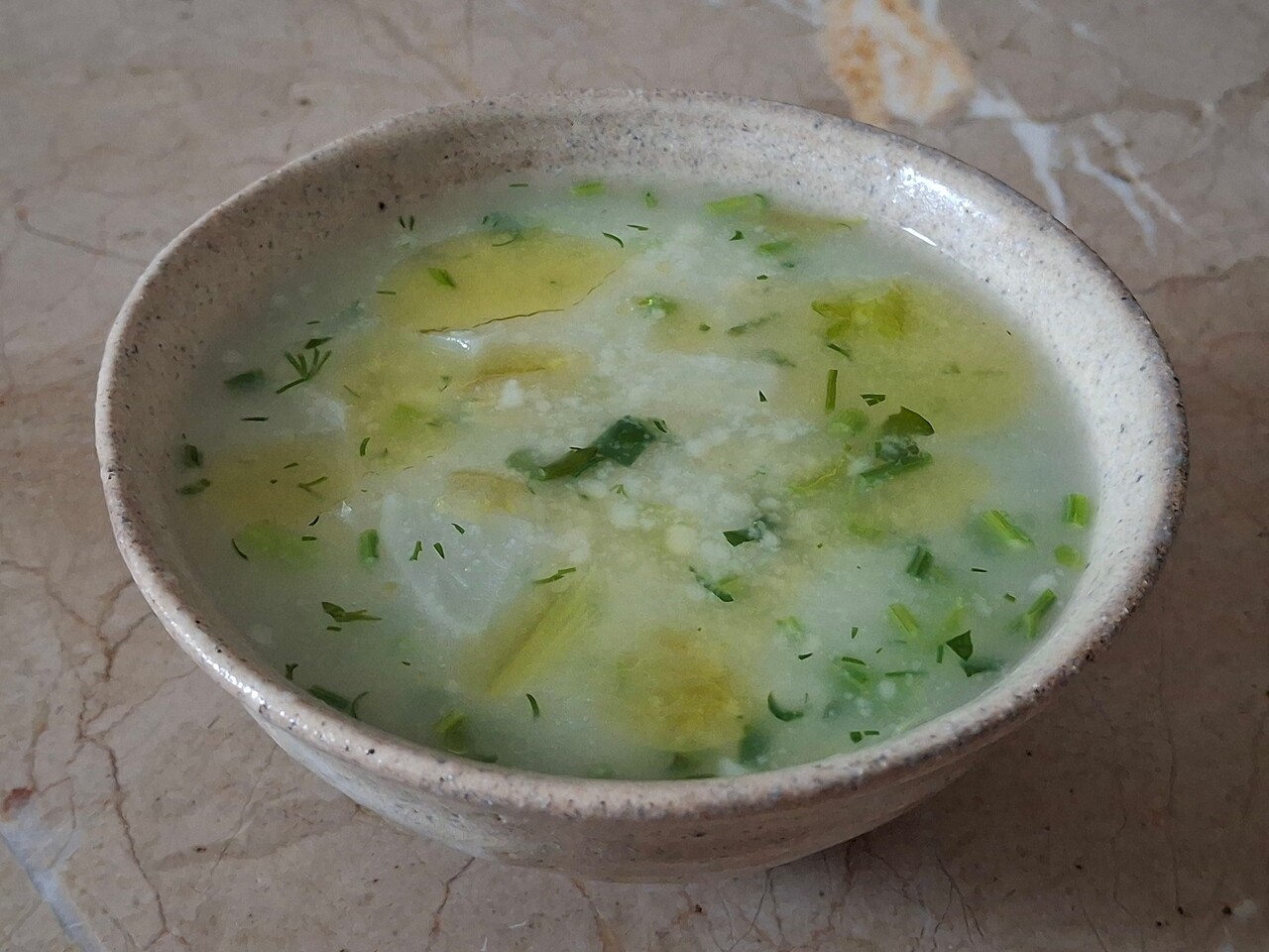 薄めに作って塩だけで味つけしたトラハナスープに、かぶ、レタス、パセリ、セロリ、ディルの五草。仕上げに垂らしたオリーブオイルも数えたら六草?日本の七草とは違うけど、清々しい気分になれるお粥風スープでした。
