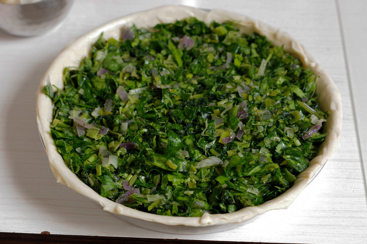 こういった野菜のパイは、フェタチーズ入りと、チーズなしの二スティシミ(精進ヴァージョン)があります。チーズなしだと次女が食べないのだけど、常にチーズ入りで作ってるとレシピが増やせないのでニスティシミにしました。今回は青菜を茹でず、塩をして置いておく方法で。玉ねぎとポロねぎ(普通のねぎでも)は炒めて甘味を引き出し、水気を軽く絞った青菜、ハーブをあわせます。塩こしょうだけの素朴な味つけですが、青菜やハーブの風味が生かされておいしいのですよ。ギリシャでこの手のパイによく入れるカフカリスラは日本にはなさそうだけど、よもぎをほんの少し入れたら似た雰囲気を出せるかなと想像しています。