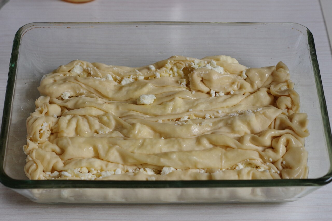 もうひとつのチーズパイは、保険で作ったつもりなのだけど次女が好むかは若干微妙なタイプ。他にもいくつか名前がありますがパツァヴロピタと呼ばれるもので、日本語にすると「雑巾パイ」でしょうか。フィロ生地をぐしゃっとラフにまとめて型に入れるので、そう呼ばれます。一般的には市販のフィロ生地で作られ、手間なく作れるお手軽パイとして知られます。ボロボロになった生地でもいいので、裂けていたりあまり状態がよくない冷凍フィロの利用法としても。