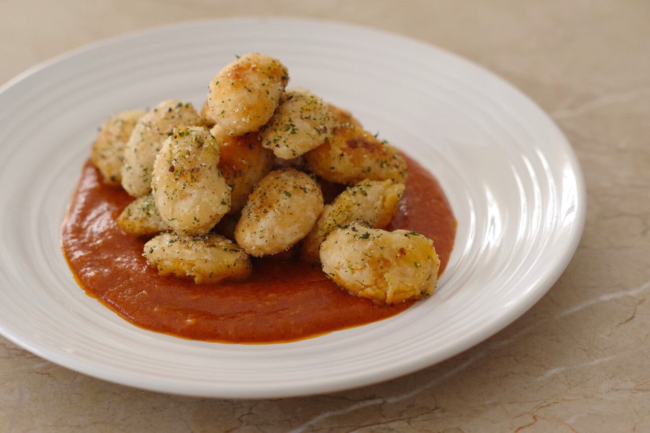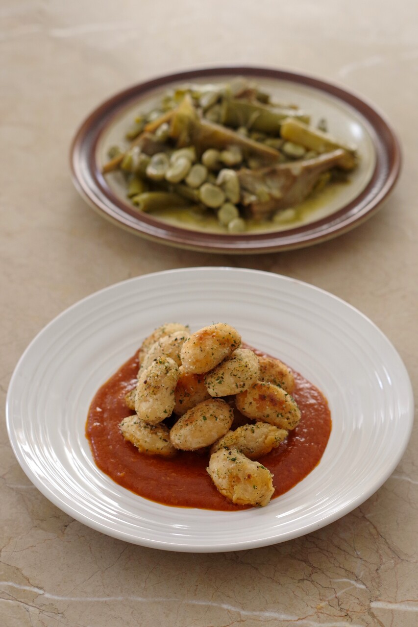 揚げ油でマカロを作るので、豆が冷めないうちに手早く作業します。鍋に残った油が多すぎたら減らし、底にたまった小麦粉で足りなそうなら衣に使った小麦粉を少し足します。すりおろしたにんにく(完成品写真の量なら、あまり大きくない1片ぐらい)を加え香りが立ったら、トマトペースト、ワインビネガー、パプリカ(辛いのでもマイルドなのでも好みで)を加え水でのばします。とろみが出るまで煮、塩で味をととのえます。器に豆のフライとマカロを好きなように盛りつけてできあがり。