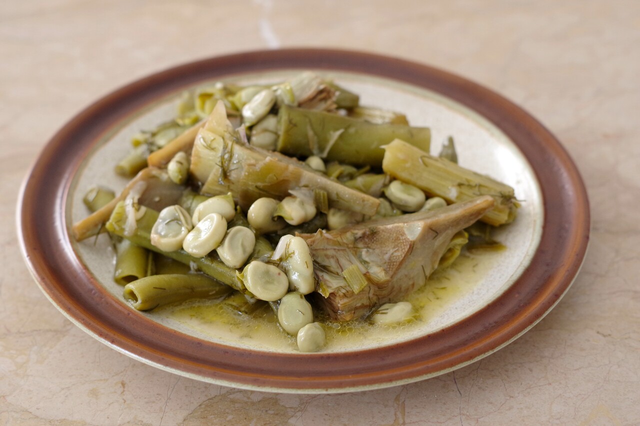この日のもう一品は、そら豆とアーティチョークの煮込み。カサラ・デフテラのメニューに加えようかなと、土曜の市場でそら豆を衝動買いしてたのだけど、結局使わず持ち越したのでした。柔らかいさやごとの若いそら豆とアーティチョークとあわせた煮込みは、春を感じられる伝統的なギリシャ料理です。