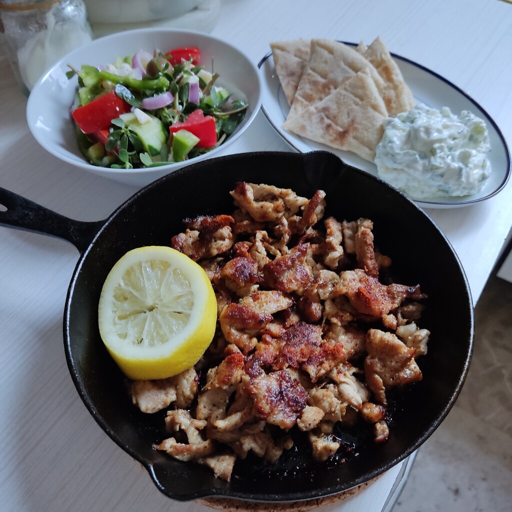 晩ごはん(トップ写真)は毎週土曜定番の豚肉料理なんですが、今回はスキレットでギロス風豚肉炒めにしました。ギロスって重ねて焼いたお肉を削ぎ切りにするから、最初からスライスしたのを炒めるとやっぱり違うんですけどね。スーパーのお肉コーナーで売ってる「ギロス」も炒めるタイプなので、まあこれはこれでいいのかもしれません。