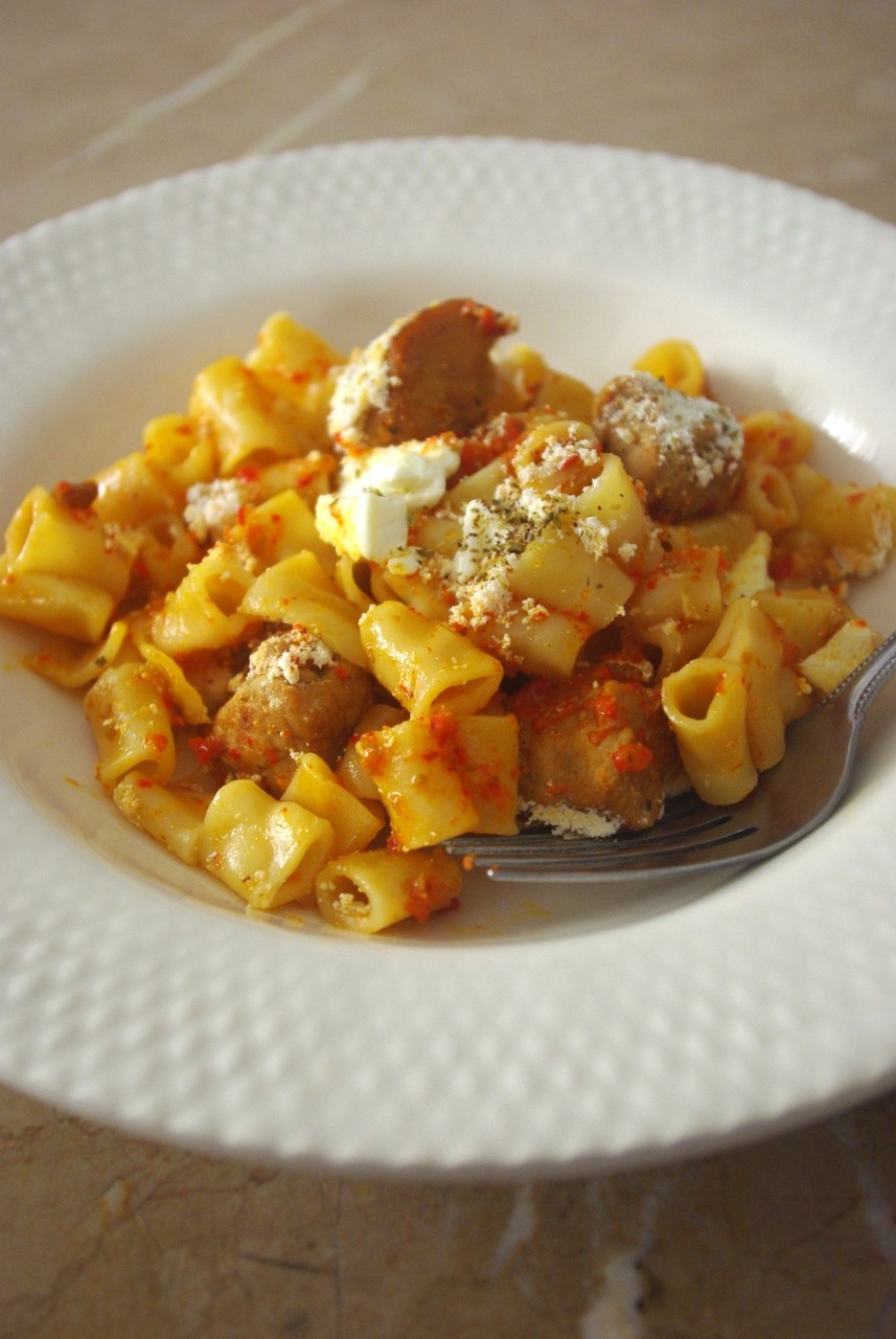 ギリシャでポピュラーなユベチの要領で、チューブ型のパスタをオーブンで炊きました。