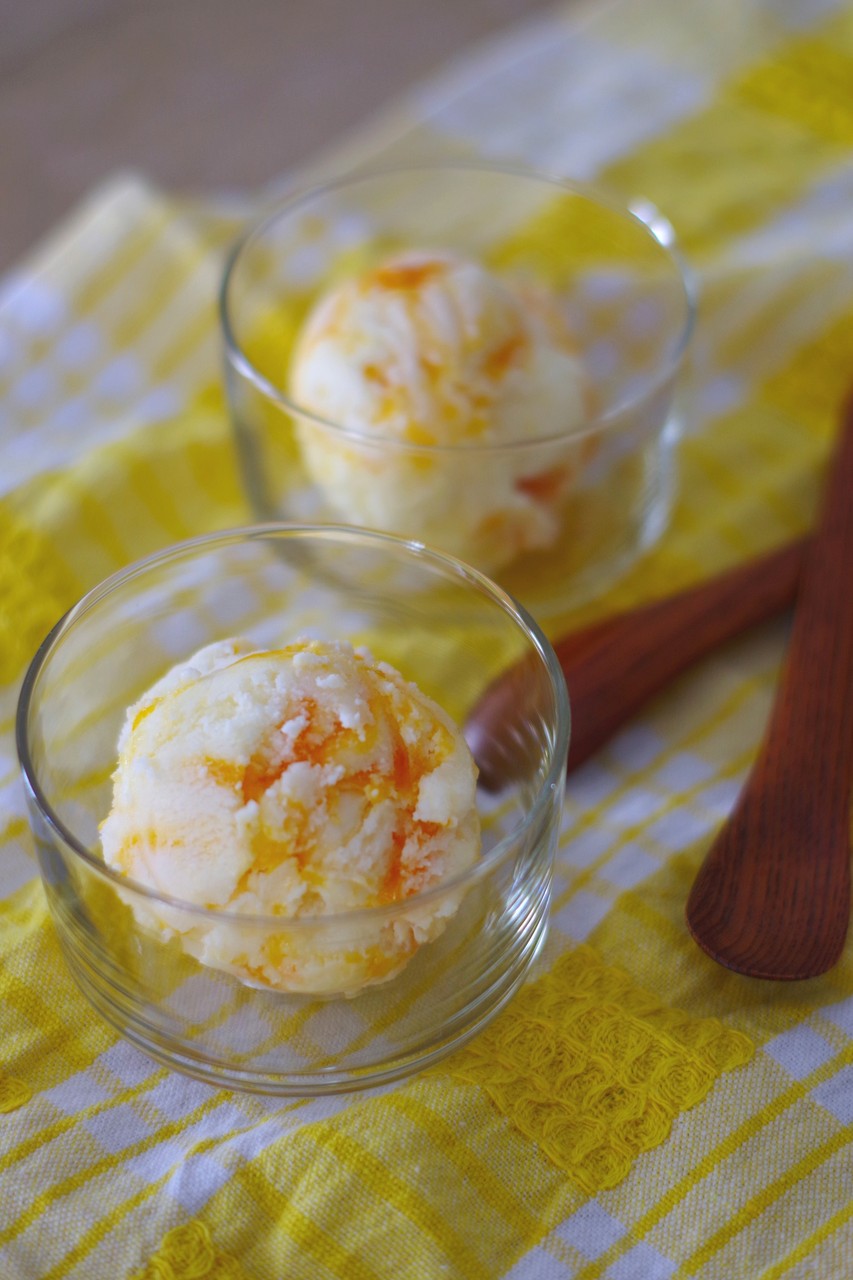 杏干し(梅干もどき)用に買った小さめのあんずの、少し傷があったりするものを適当なジャムにしておいたのですが、タルトにするには量が少ないしどうしようかな……と放置していたらこのアイスクリームを思いつきました。