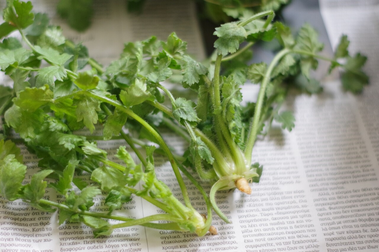 いかは下処理し、食べやすく切っておく。玉ねぎは短い薄切り、にんにくは入れても入れなくてもいいけど、粗みじんくらいに刻む。トマトは控えめな量をすりおろすか皮をむいて刻む(もしくは生トマトじゃなくトマトペーストでも)。カフカリスラは根っこも使用。きれいに洗って、根元は縦半分に切り、あとはざく切りにしておきます。あればチャービルも適量刻んでおきます。