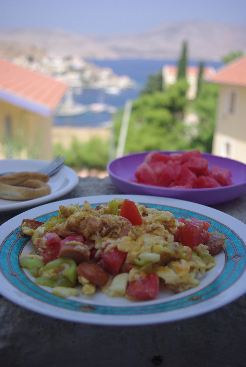 さて、長女希望のオムレツランチです。たっぷり野菜とソーセージ、ケファロティリ(チーズ)も入った具沢山の田舎風スクランブルオムレツ、シミ島の甘くないクルラキャ、スイカ。