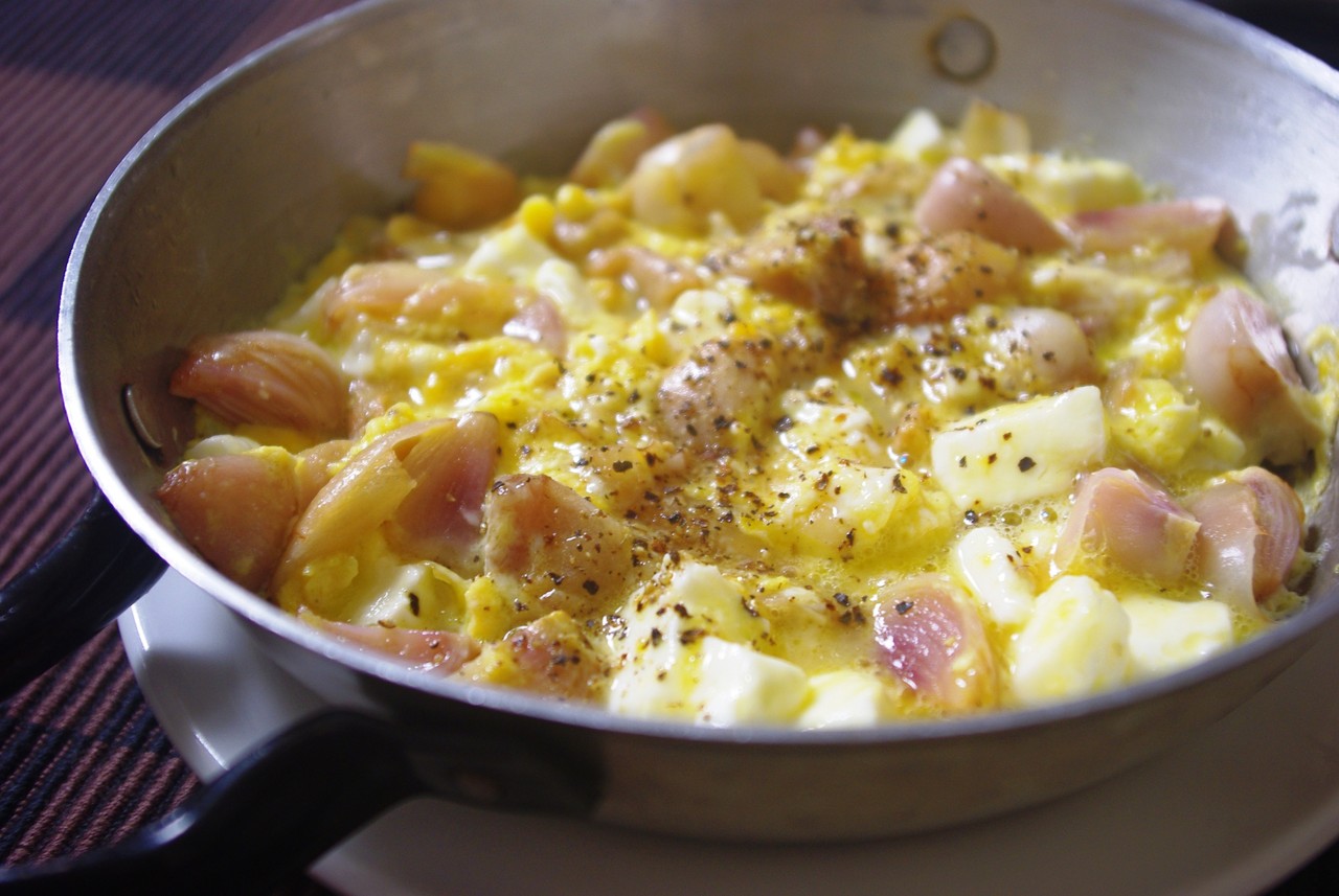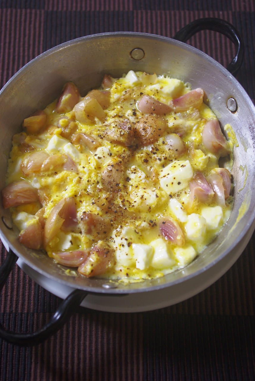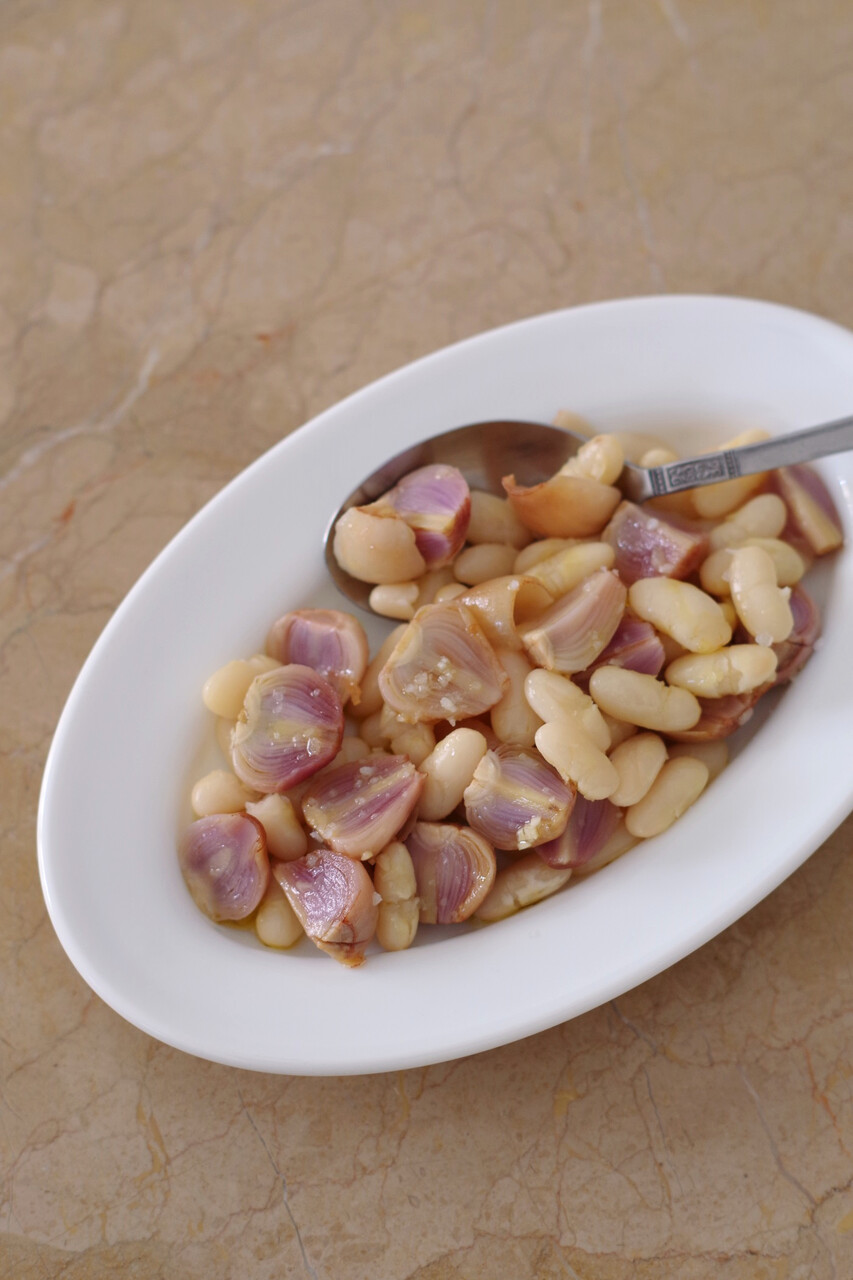 球根と白いんげん豆はそれぞれやわらかくなるまで茹でておき、水気を切って器へ。温かい方がおすすめです。