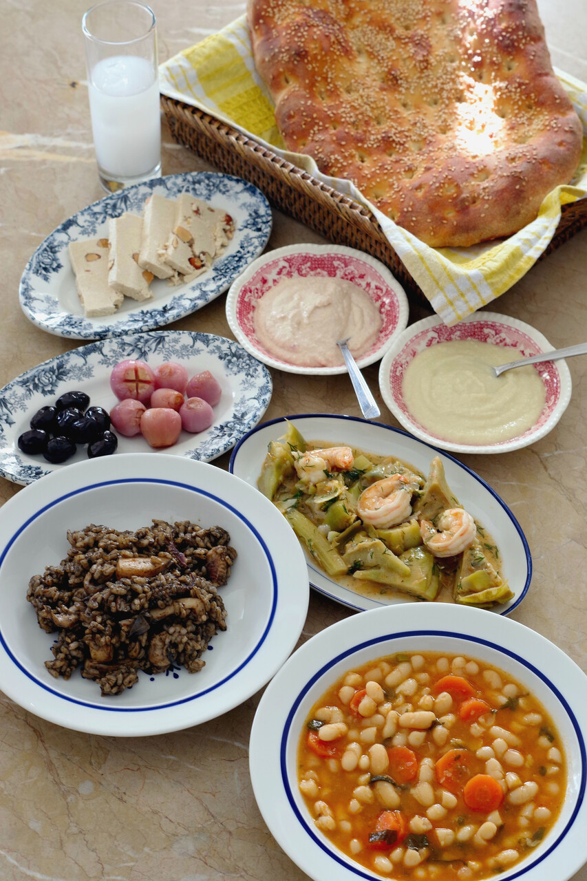 スコルダリァ(ガーリックディップ)や豆スープはシーフードを食べない家族用。断食メニューじゃないですが、写真の料理以外にアーティチョークのリゾットも。