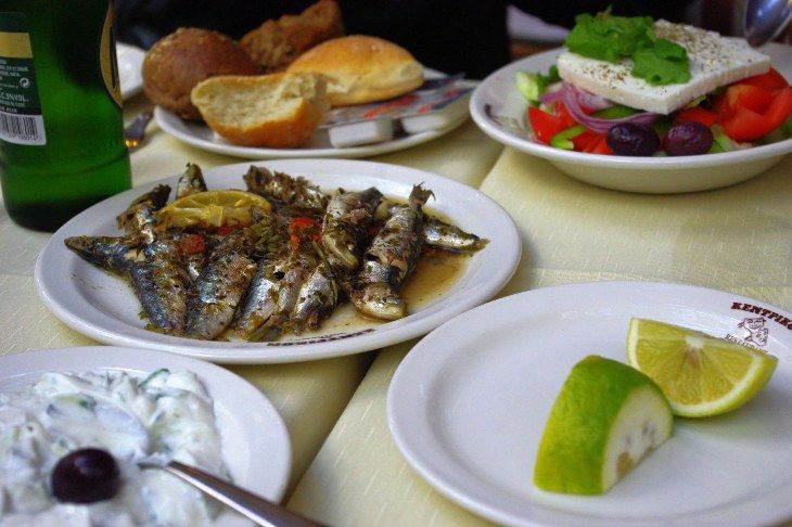 私は軽めにイワシのオレガノ風味オーブン焼き、夫はサガナキ(揚げチーズ)をチョイス。あとは子供たちが食べたいものということで、毎度おなじみケフテダキャ(揚げミートボール)、ジャジキ(ヨーグルトときゅうりのニンニク風味ディップ)、ホリアティキ(ギリシャ風サラダ)。