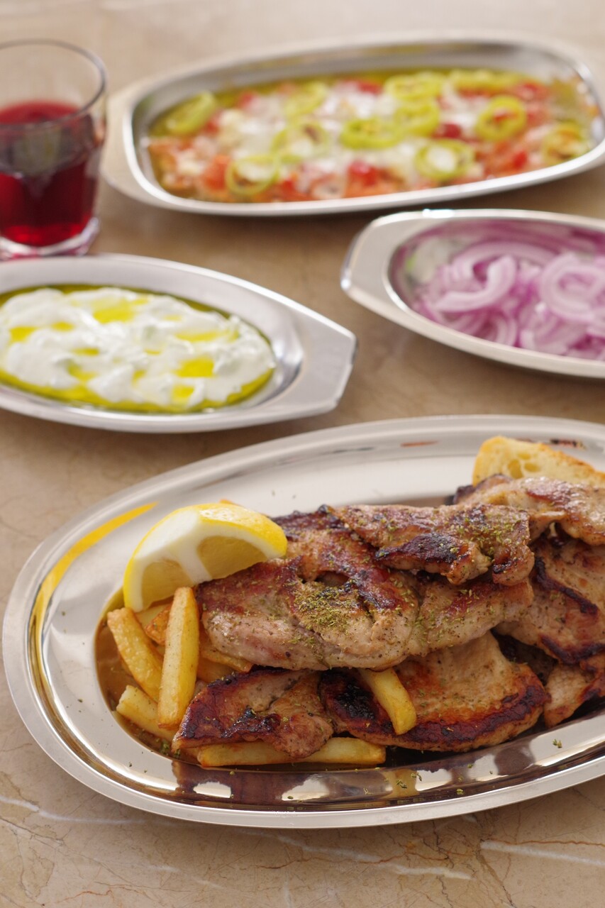オリーブ、トマト、ルッコラと一緒のお皿に盛り付けた黄色い豆はルピナスの種子であるルピーニ(ルピナ)。ルピーニは現代のギリシャではそれほど食べられるものではなく、アテネでは品揃えのいい乾物屋さんなどで売っています。ペロポニソス半島のラコニアやクレタ島では断食期間によく食べるそう。特に厳しく節制をする日には乾パンやナッツ、ほとんど手を加えない野菜といったものだけ口にするのですが、ルピーニもそんな質素な食べもののひとつです。
